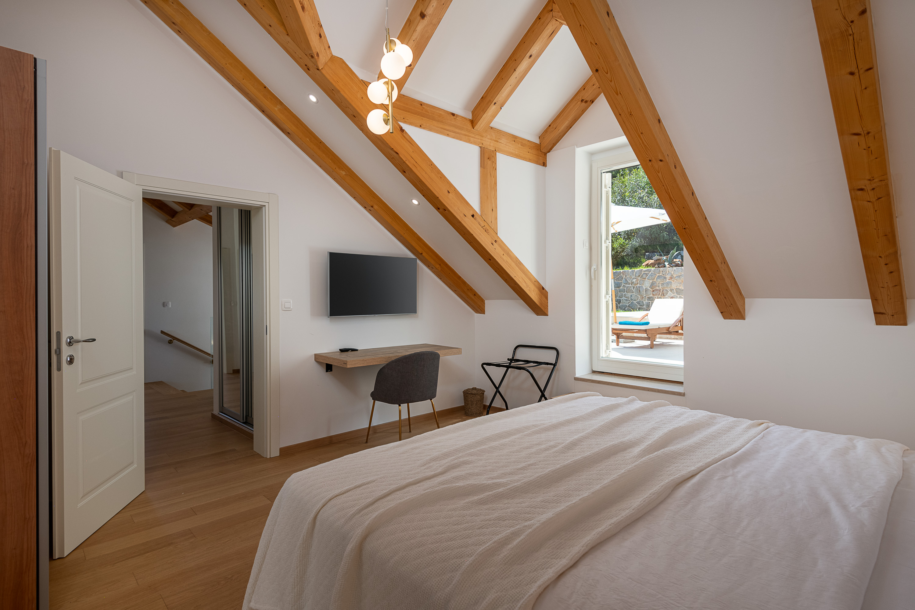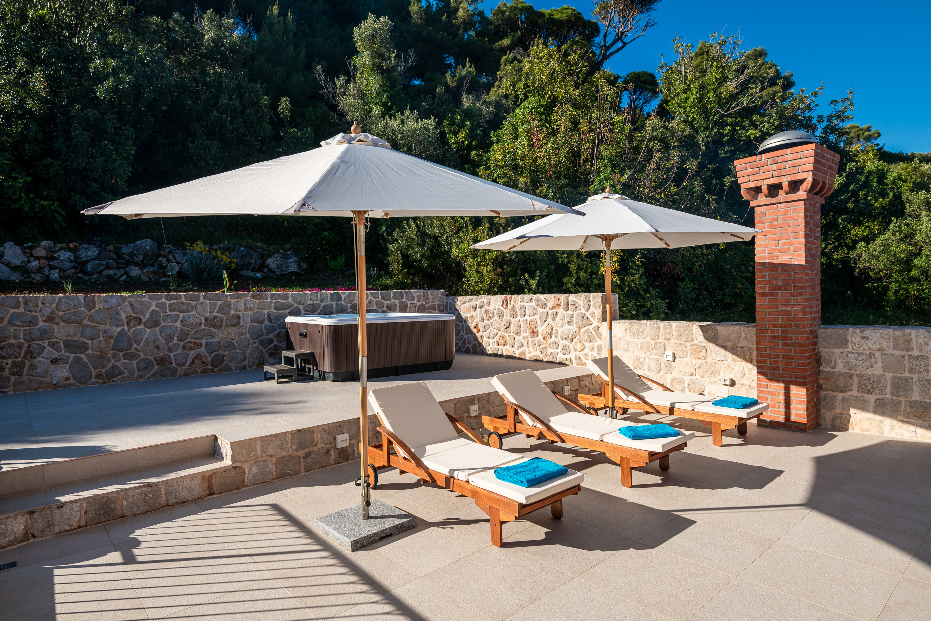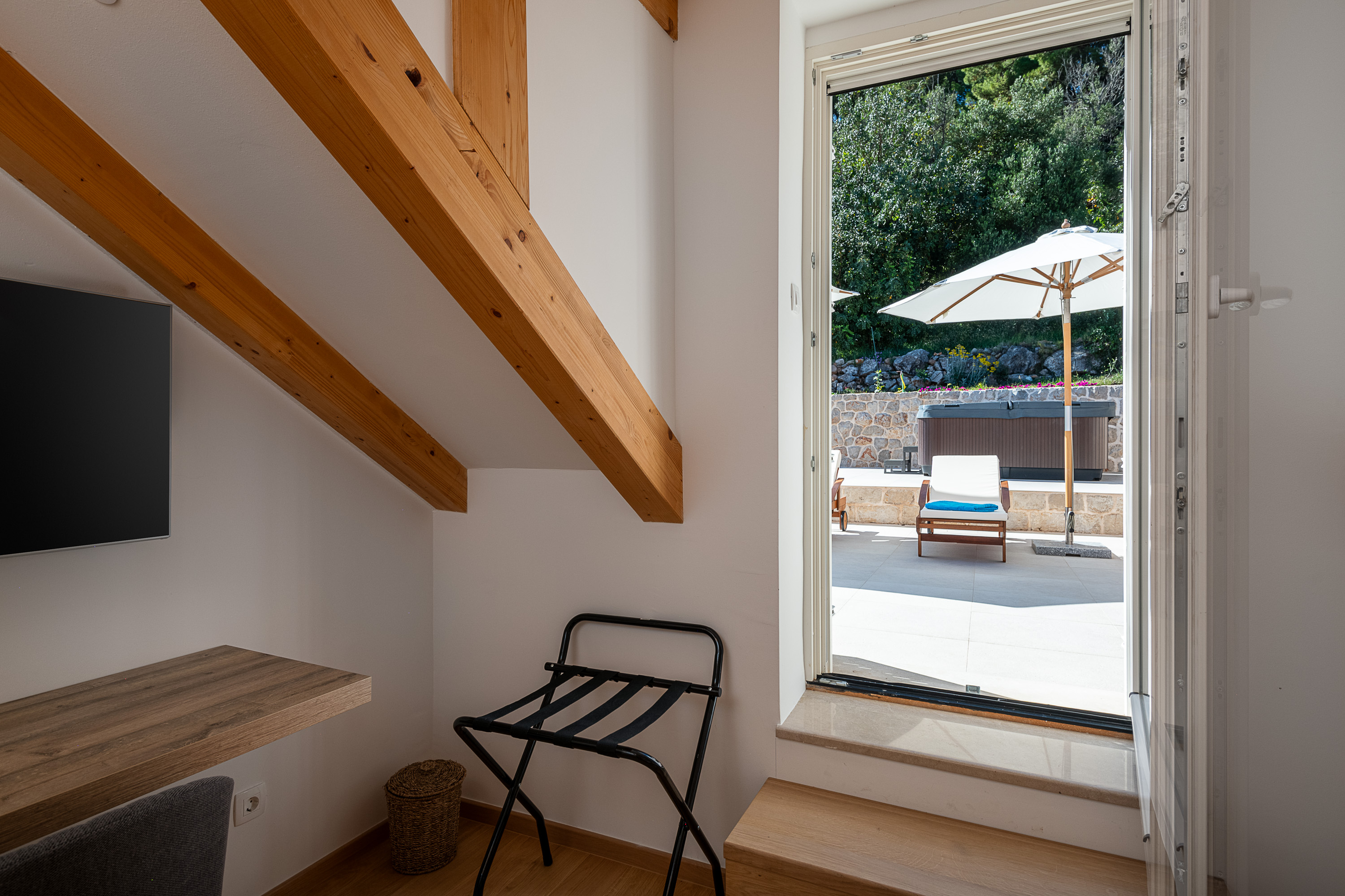 This room features a spacious terrace complete with a jacuzzi, umbrellas and sunbeds.
